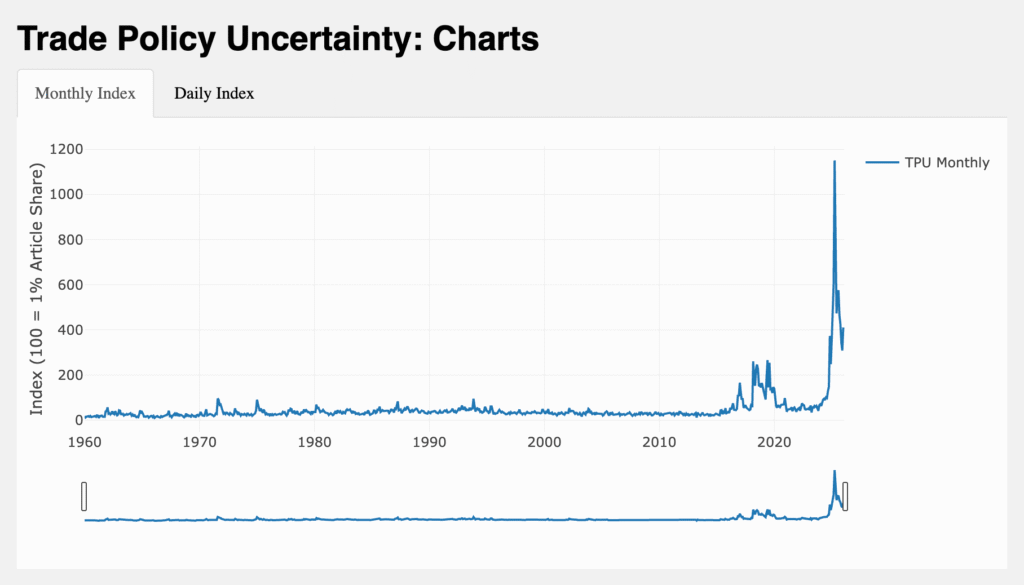 The OECD/Federal Reserve Trade Policy Uncertainty index showed a decline from April’s historic peak of 1,151.36 but remained substantially elevated through late 2025, remaining approximately 250 points above its four-year average according to Eurochambres analysis.