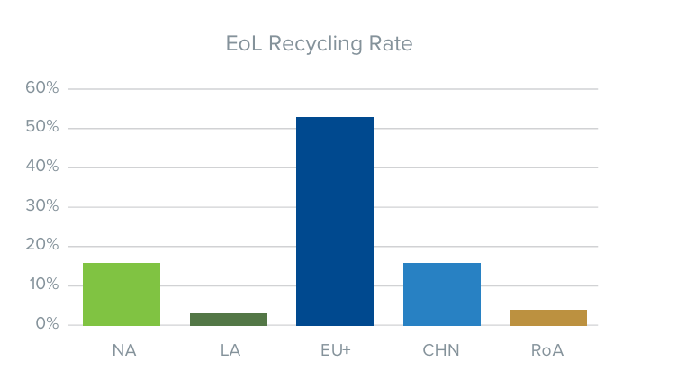 The European Union achieves a zinc end-of-life recycling rate exceeding 50%—significantly above the recycling rate of other regions. Even China and North America have a zinc end-of-life recycling rate between 10-20%, while other regions perform at ca 5% zinc end-of-life recycling rate.